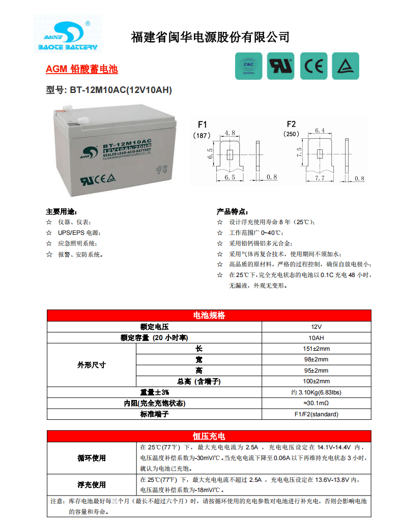 推荐的均充电压:2.35~2.40V/cell在25℃温度下单格温度补偿:-5mV/℃